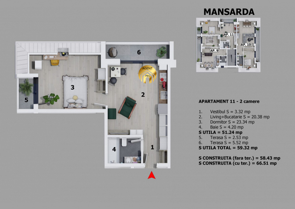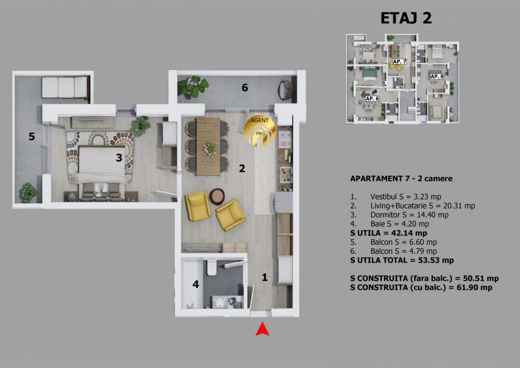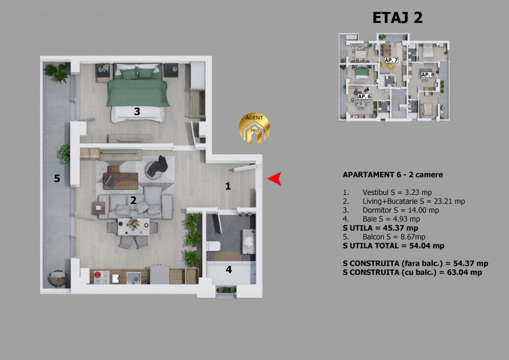 Suprafata utila 45 mp + Balcon 9 mp = 54 mp