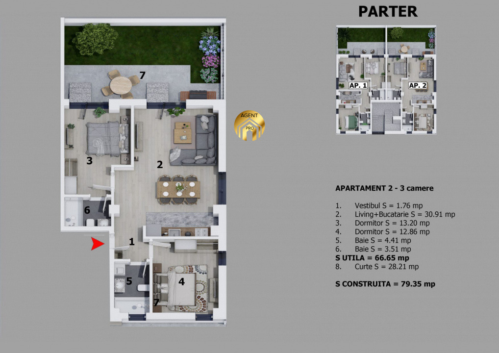 Apartament 3 Camere + Teren 100 mp - Prima Inchiriere - Disponibil Imediat