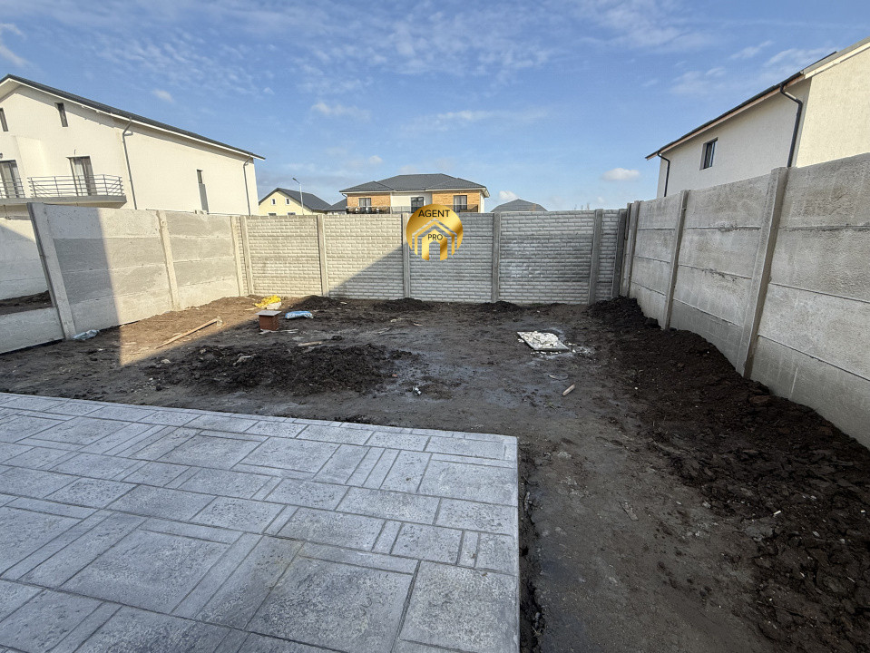 În curte:terasa la iesire din living, locuri de parcare si zona verde.