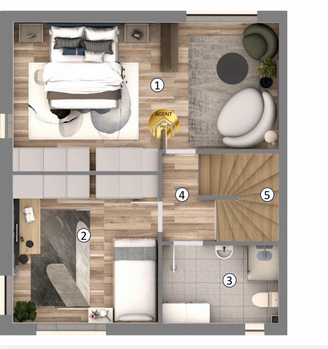Etaj: Dormitor matrimonial cu baie proprie, Dormitor secundar cu baie proprie, Hol
