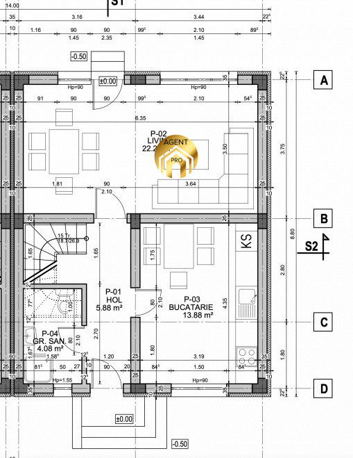Parter: hol de acces, living, bucatarie inchisa, zona de dining, baie, spatiu de depozitare sub scara.