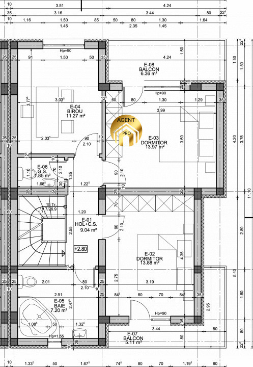 Etaj: dormitor 1 cu balcon, dormitor 2, baie comuna, hol, dormitor matrimonial cu baie proprie 7.2mp si balcon