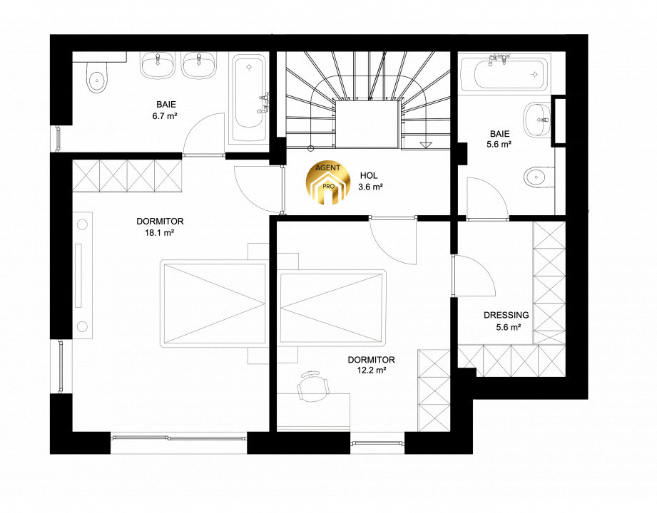 Etaj 1: Dormitor 1 cu baie, dormitor 2 cu dressing si baie, hol