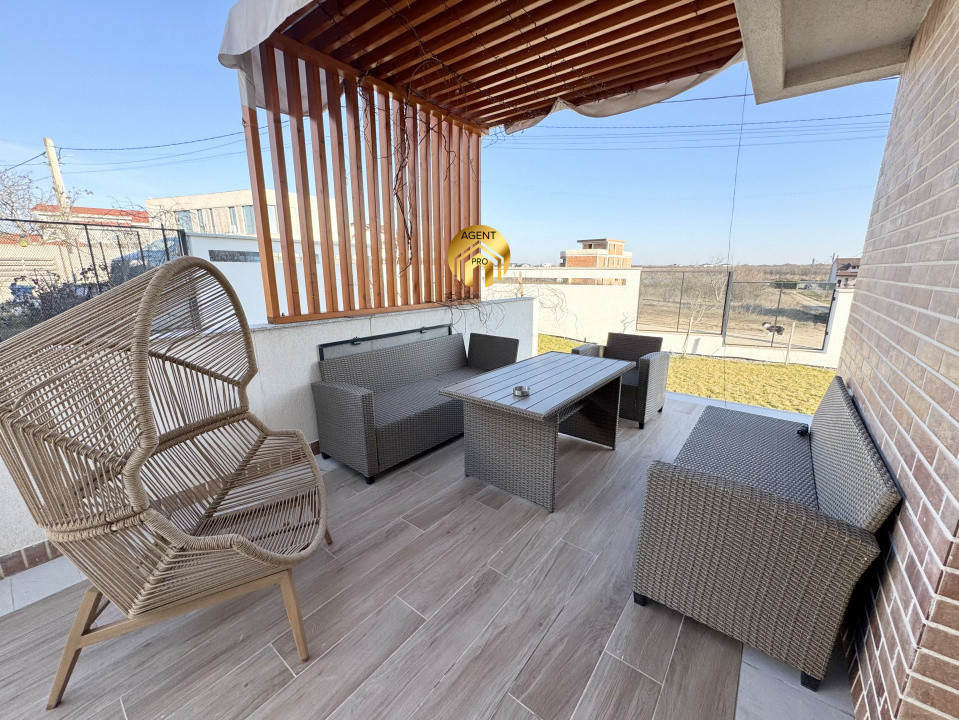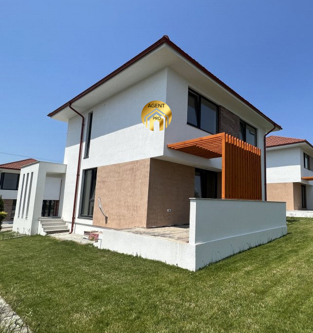 În curte: doua locuri de parcare, terasa si zona verde generoasa, amenajare cu pavaj si gazon, pomi si pergola de lemn peste terasa.