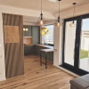 Parter: terasa intrare, hol intrare, depozitare sub scara, birou/dormitor, living, bucatarie, zona de dining, baie, spatiu de depozitare langa baie, terasa exterioara.