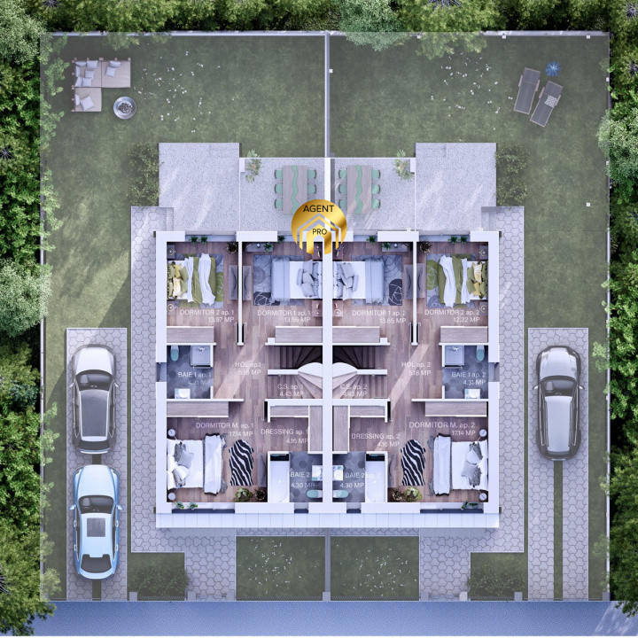 Etaj 1: Dormitor matrimonial cu dressing și baie proprie, inca doua dormitoare cu baie comuna.