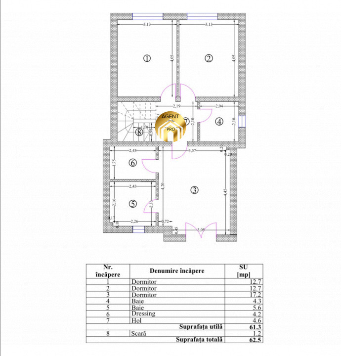 Etaj: hol, un dormitor cu dresing si baie proprie, si inca doua dormitoare cu baie comuna.